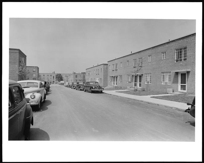 185th Street and Horace Harding Boulevard. Fresh State Meadows Housing, three story exterior facing on courtyard garden.