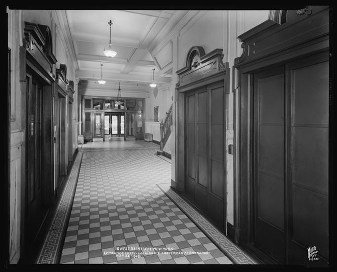 10 West 33rd Street. Entrance lobby prior to alterations, looking S.W. at westerly elevator grilles.
