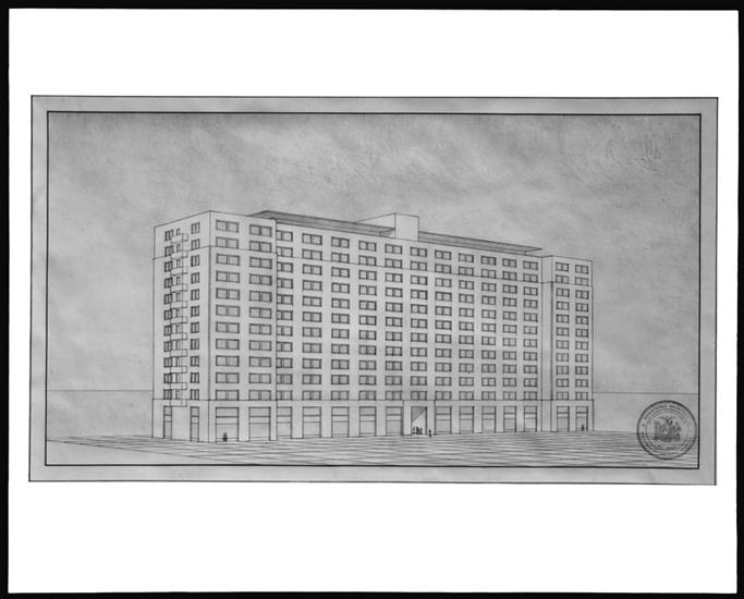 Seven-story block front apartment, pencil rendering by Scheffler.