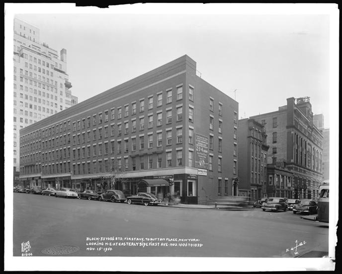 55th to 56th Street between 1st Avenue and Sutton Place. From N.W. corner of 56th Street and 1st Avenue, looking S.E. at east side of 1st Avenue and south side of 56th Street.