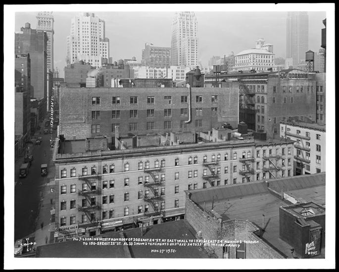 153-161 East 24th Street and 150-158 East 25th Street. Legal record photo, looking west through 24th Street from N.E. corner of 3rd Avenue.