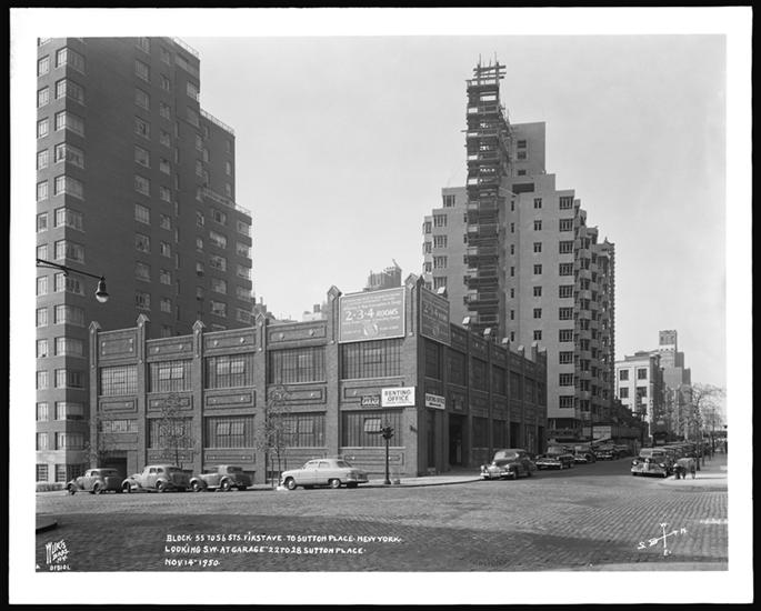 55th to 56th Street between 1st Avenue to Sutton Place. View from south side of 55th Street near center of block, looking N.E. at garage west #36 Sutton Place.