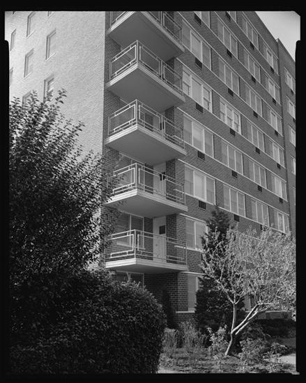 Bowne Avenue. Bowne Apartments, courtyard and entrance detail.