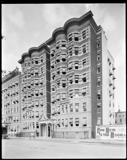 [Apartment building at the intersection of Riverside Drive and West 110th Street.]