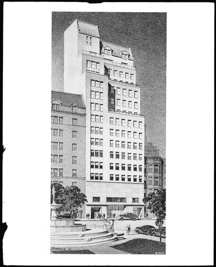 West 58th Street at the corner of Seventh Avenue. Apartment house, watercolor rendering.