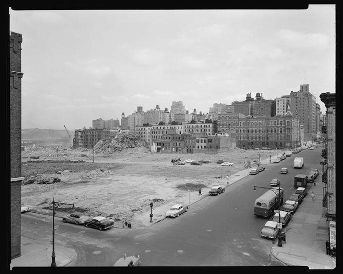 Lincoln Towers, view looking N.W. from S.E. corner of 66th Street and Amsterdam Avenue, Red Cross Headquarters center, shopping center at right.