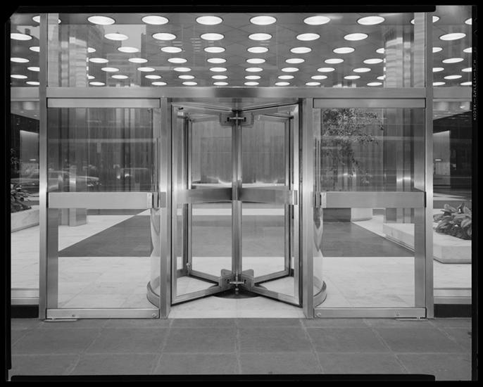 Park Avenue between 53rd and 54th Street. First National City Bank Building, upright detail of main lobby, one column and planter.