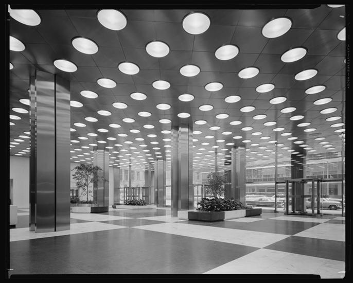 Park Avenue between 53rd and 54th Street. First National City Bank Building, horizontal detail of main lobby, looking up at ceiling and lights.