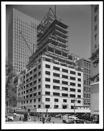 5th Avenue and 51st Street. Crowell Collier Building, bldg under construction, detail of south front showing sign leased to National City S'r [Bank] of N.Y.