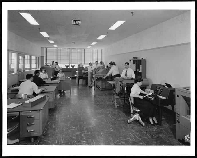 Metropolitan Avenue and Woodhaven Boulevard [41-10 22nd Street?]. McKesson and Robbins, clerks taking orders over the phone.