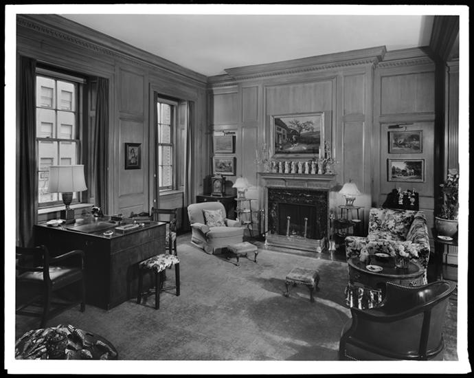 6 East 69th Street. Mrs. Wm. K. Laughlin [Dallas Pratt's sister] residence, first floor living room at screen.