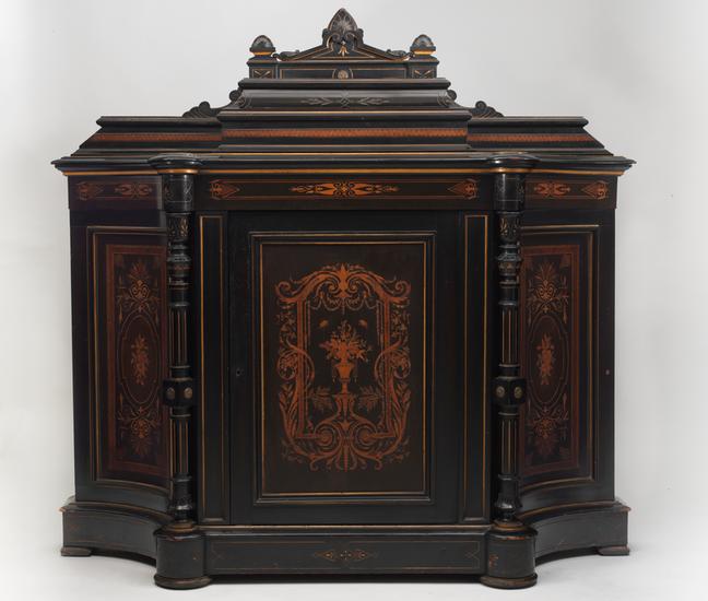 Folding fan of painted leaf depicting 18th-century style figural vignette and musical trophies