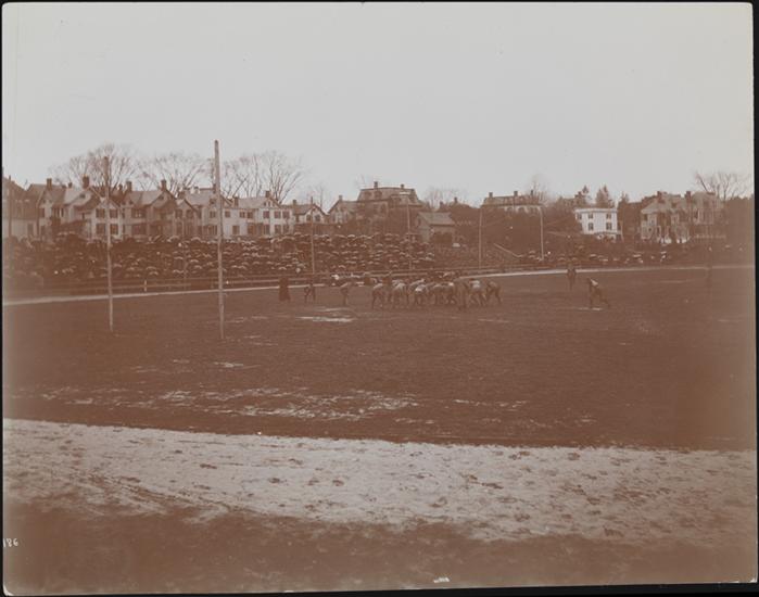 A football game in the rain in progress in Orange, N.J.; spectators with umbrellas in grandstands, dwellings visible beyond.