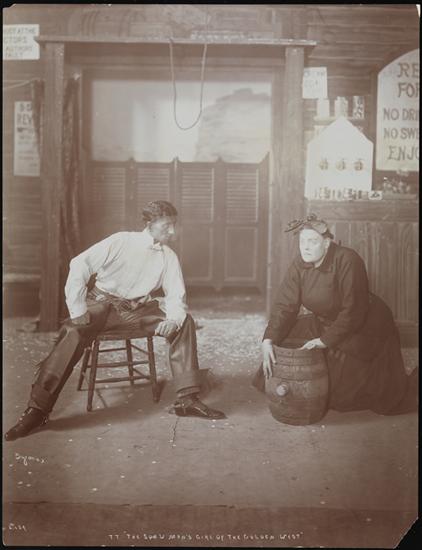 A scene from the production of "The Squaw Man's Girl of the Golden West" featuring Marie Dressler, Edward J. Connelly and Joe Weber and presented at Joe Weber's Music Hall in 1906.