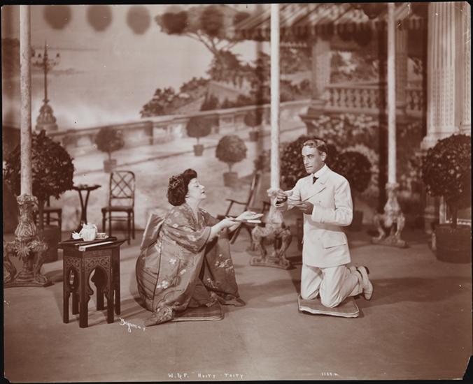 Fay Templeton as Daisy Ragtymme and Fritz Williams as Kubelik, the violin virtuoso, in a scene from Weber & Field's burlesque "Hoity Toity," presented at the Weber & Field's Music Hall in 1902.