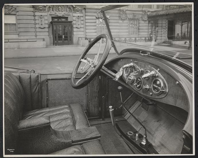 Close up of the interior of a circa 1921 Lexington Roadster parked on the street in front of a neo-classical building.