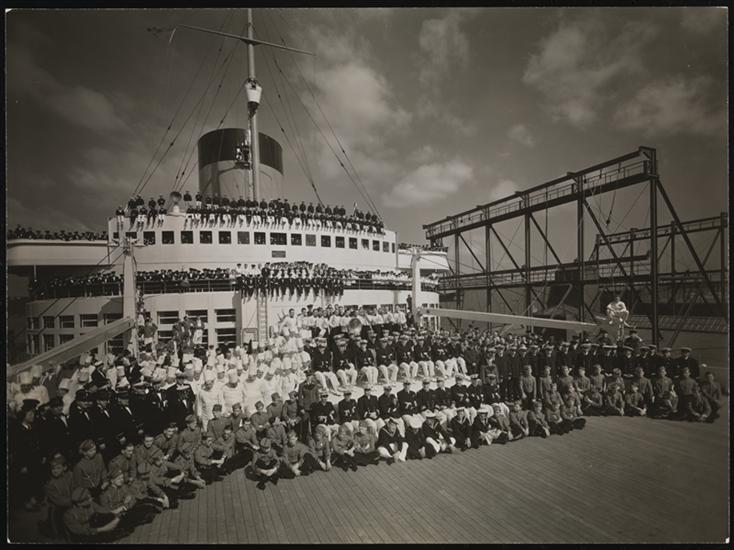 French Line, S.S. "Normandie", Pier #88 N.R., Group, Most of the Crew Grouped on the Bow & Bridge.