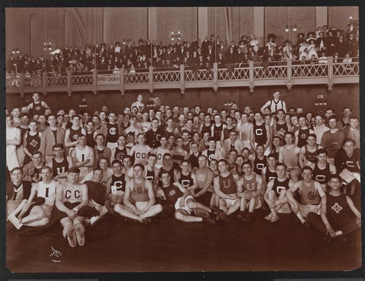Description Group of young men in athletic gear standing and seated on the gymnasium floor of Christ Church with spectators in background.