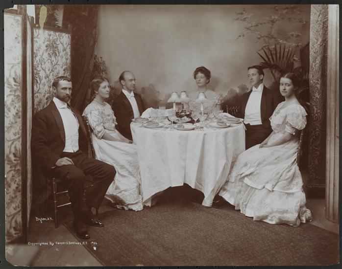 Three women and three men formally dressed, seated at a table at a dinner given to Arnold Bennett, novelist and dramatist, at Harper Brothers.