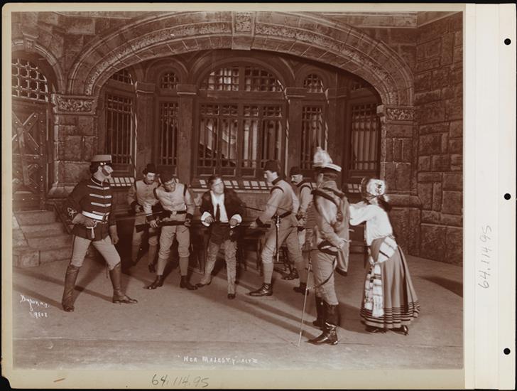 A scene from Act III of J.I.C. Clarke's dramatization of Knight Tompkins play "Her Majesty, The Girl Queen of Nordenmark" presented at the Manhattan Theatre in 1900.