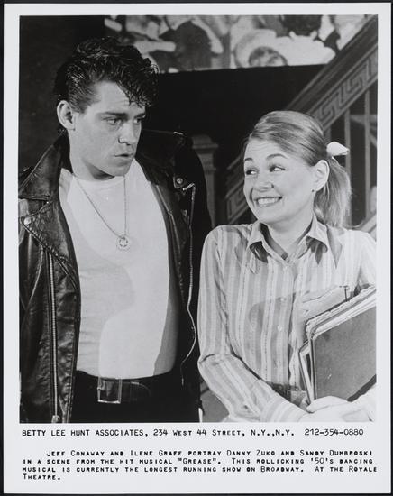 [Ilene Graff as Sandy Dumbrowski and Ilene Kristen as Patty Simcox in "Grease".]