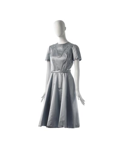 Dinner dress in royal blue taffeta with black organdy cutwork overlay