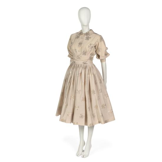 Evening dress in beige silk twill and heavy guipure beige cotton lace