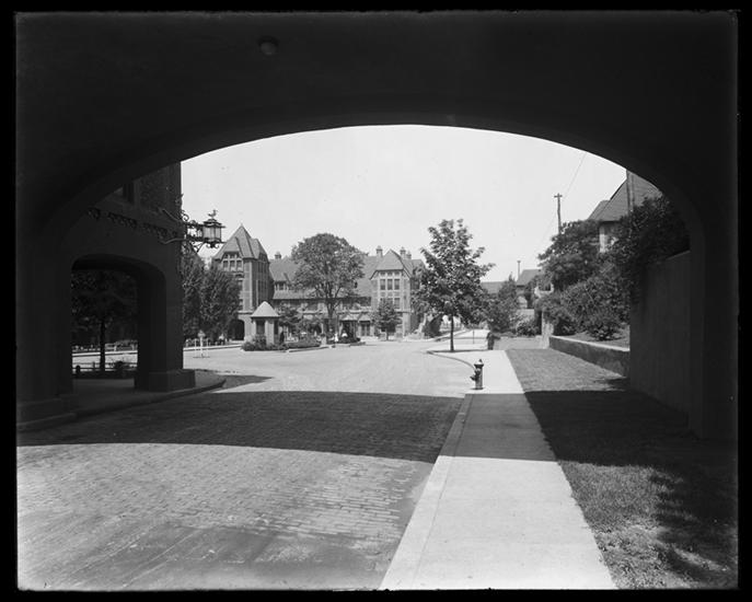 General bird's-eye view [of housing development] from tower looking south across green.