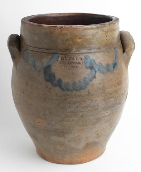Salt-glazed stoneware pot with red ceramic body covered with brown glaze, decorated with cobalt oxide swags at shoulder and across handles, and incised lines around shoulder above maker's mark.