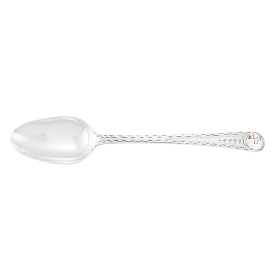 Spoon with rounded, downturned handle with bright-cut oval reserve (blank) and four bellflowers on obverse, short back midrib on reverse above egg-shape bowl with single back drop and swage decoration "I LOVE LIBERTY" [bird/cage]. Mark: Struck twice on handle reverse in rounded rectangle: E [pellet] B