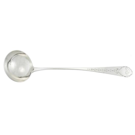 Ladle with round bowl and rounded drop, tapering downturned handle with rounded end, bright-cut engraving, and mid-length back midrib. Inscription: Initialed on handle obverse: AEW in feathered script. Mark: On handle reverse, struck three times: W [pellet] R in shaped enclosure