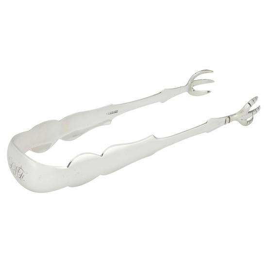 Sugar tongs with claw ends and shaped shanks. Inscription: Engraved on bow: LMF in feathered script Mark: Inside each arm struck twice: G.EOFF in rectangle
