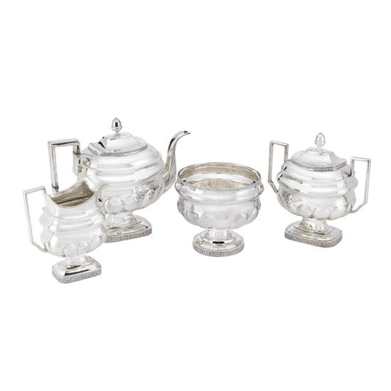 Teapot oblong-bodied with melon reeding on stepped pedestal base ornamented with die-rolled bands of grape leaves and clusters, die-rolled band of shells at lip, squared-C handle, hinged domed oblong cover and acorn finial. Part of a four-piece tea service comprising a teapot, sugar bowl, creamer, and waste bowl. Inscription: Engraved on body: R(H?)MS. Mark: Struck twice on base: C.V.G.F.