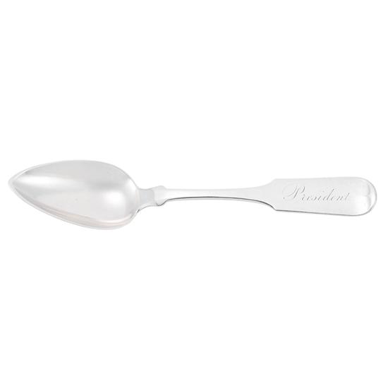 Tablespoon with upturned fiddle handle, rounded shoulders continuing to egg-shape bowl. Inscription: Engraved in script on handle obverse: "President". Mark: On reverse: "J.L. MOORE" in rectangle and "NEPTUNE" in rectangle.
