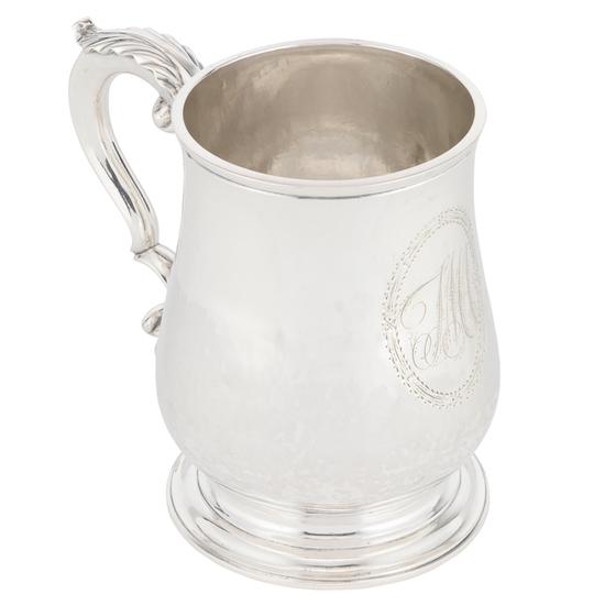 Cann with rasied tulip-shape body with slightly everted lip on cast circular foot, S-scroll handle with leaf furl and engraved with oval bright-cut medallion enclosing monogram opposite handle. Inscription: Engraved with script initials within bright-cit oval on body opposite handle: TMA Mark: Struck on underside of base in script: B & P / NYork