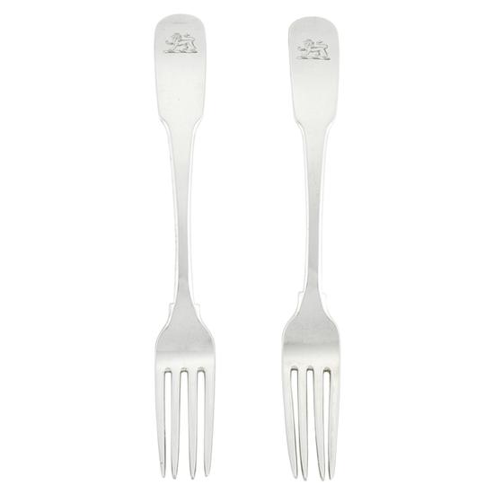 One of a pair of dessert forks with down-curving fiddle back tipt handle and four tines. Inscription: Engraved on handle obverse: [Lenox crest.] Mark: Marked on handle reverse: RW [three pseudohallmarks.]