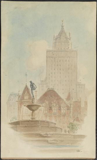 [Pulitzer Fountain, with W.K. Vanderbilt's mansion and Heckscher Building in the background]