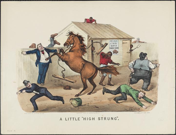 [The trotting horse Judge Fullerton biting off man's hat.]