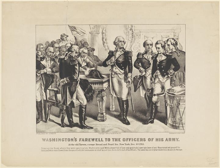 On Dec. 4, 1783, Washington, in Fraunce's Tavern, at the corner of Pearl and Broad Streets, formally bade farewell to his officers before proceeding to Annapolis to resign his commission.