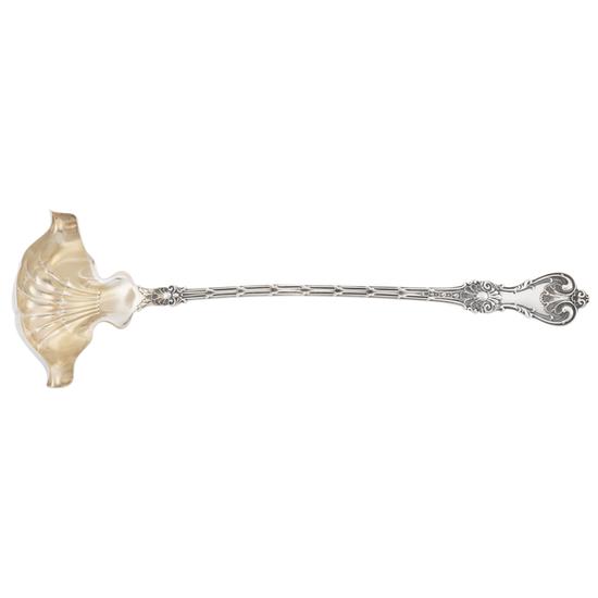 Gilt ladle with shell-formed bowl, double pouring lips, handle decorated with shell designs in the "King Edward" pattern. Mark: On bowl reverse: ["W" in a circle beside two-headed griffin] / PAT AP 23; On handle reverse: STERLING / [pseudohallmark]