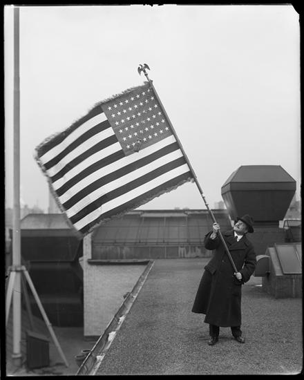[Brick building with American flag over doorway, N. 6th Avenue.]