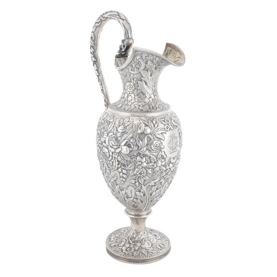 Pitcher in classical ewer form on circular foot, intergral spout in scoop form, attentuated dolphin handle, and body heavily repoussé-chased. Inscription: Engraved on body in reserve: L.G. Engraved inside rim of foot: Frederica Belmont, the gift of her grandmother Perry Sept 18th 1877. Mark: Incuse on underside of body: S. Kirk & Son / 11 oz.