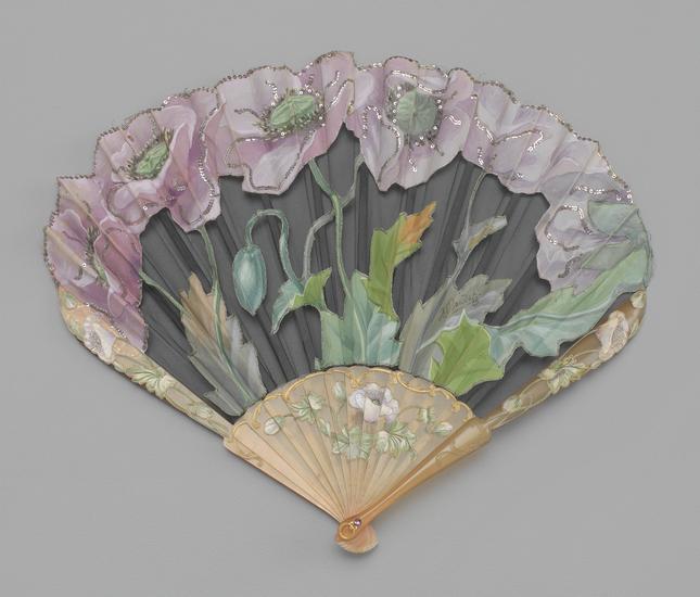 Folding fan of black silk net leaf embroidered with peacock feathers