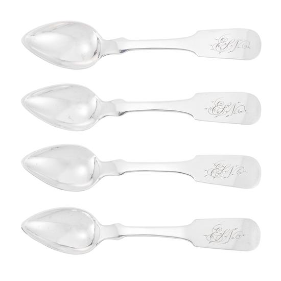 One of a set of four teaspoons with downturned fiddle handle continuing to small rounded shoulders, back tipt, and pointed egg-shape bowl with incised small rounded drop on reverse. Inscription: Initialed on handle obverse: "E S N". Mark: On handle reverse: "W.I. TENNEY".