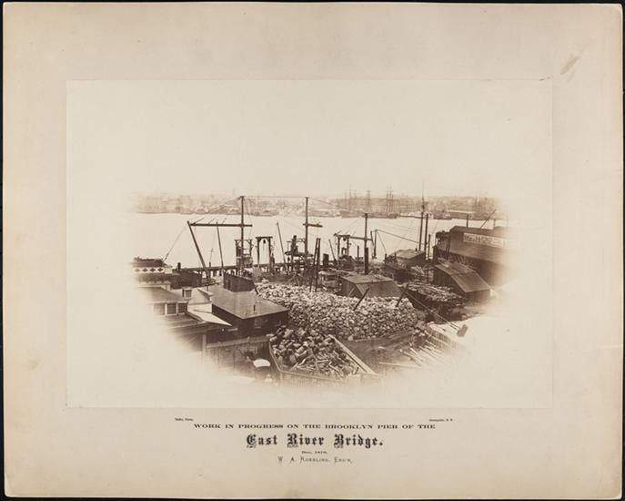 [Ships on East River, with Brooklyn Bridge in the background.]