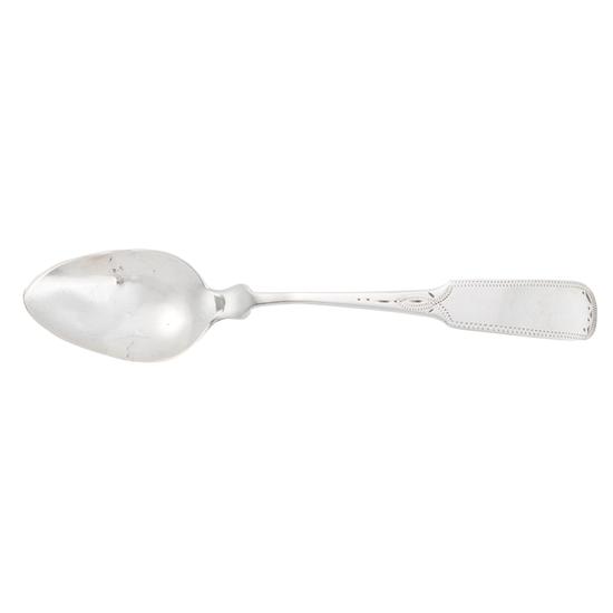 Teaspoon with pointed bowl, single bowl-backdrop, fiddle handle with rounded shoulders, bright-cut roulettework border creating a rectangular reserve and bell-flower drop on handle obverse. | Mark: Marked on handle reverse: B. WENMAN.