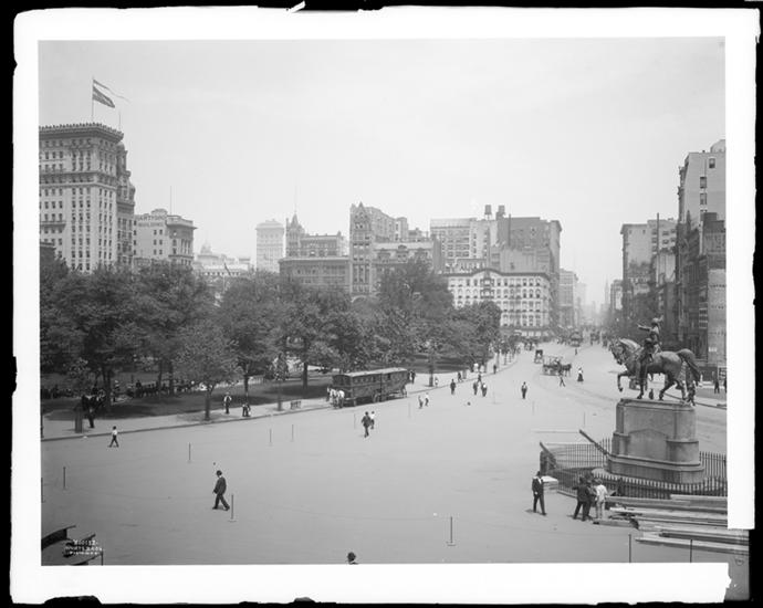 [Bird's eye view of Union Square, looking north on 4th Avenue.]