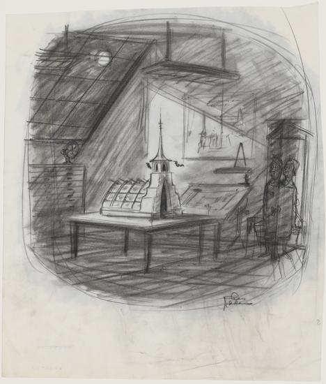 [Cleaning woman surprised by small man leaving computer by a hatch door.]