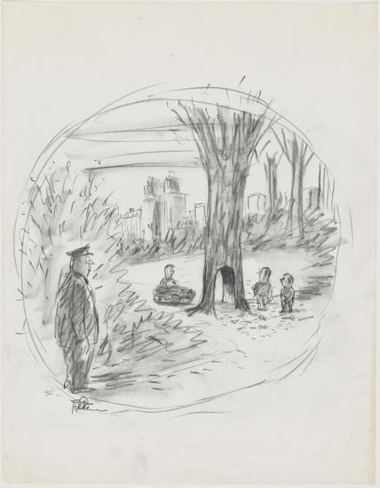 [While a wife is engrossed in the television, her husband bricks up the doorway.]