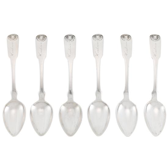 One of a set of six teaspoons with egg-shape bowl, shell on bowl back, downturned fiddle handle decorated with shell motif, and rounded shoulders. Inscription: Engraved on handle obverse: "Henderson" in script; On handle reverse: "COE". Mark: On handle reverse: "F.MARQUAND" and pseudohallmarks [profile head] [lion passant] [letter "G"] in conforming enclosures.